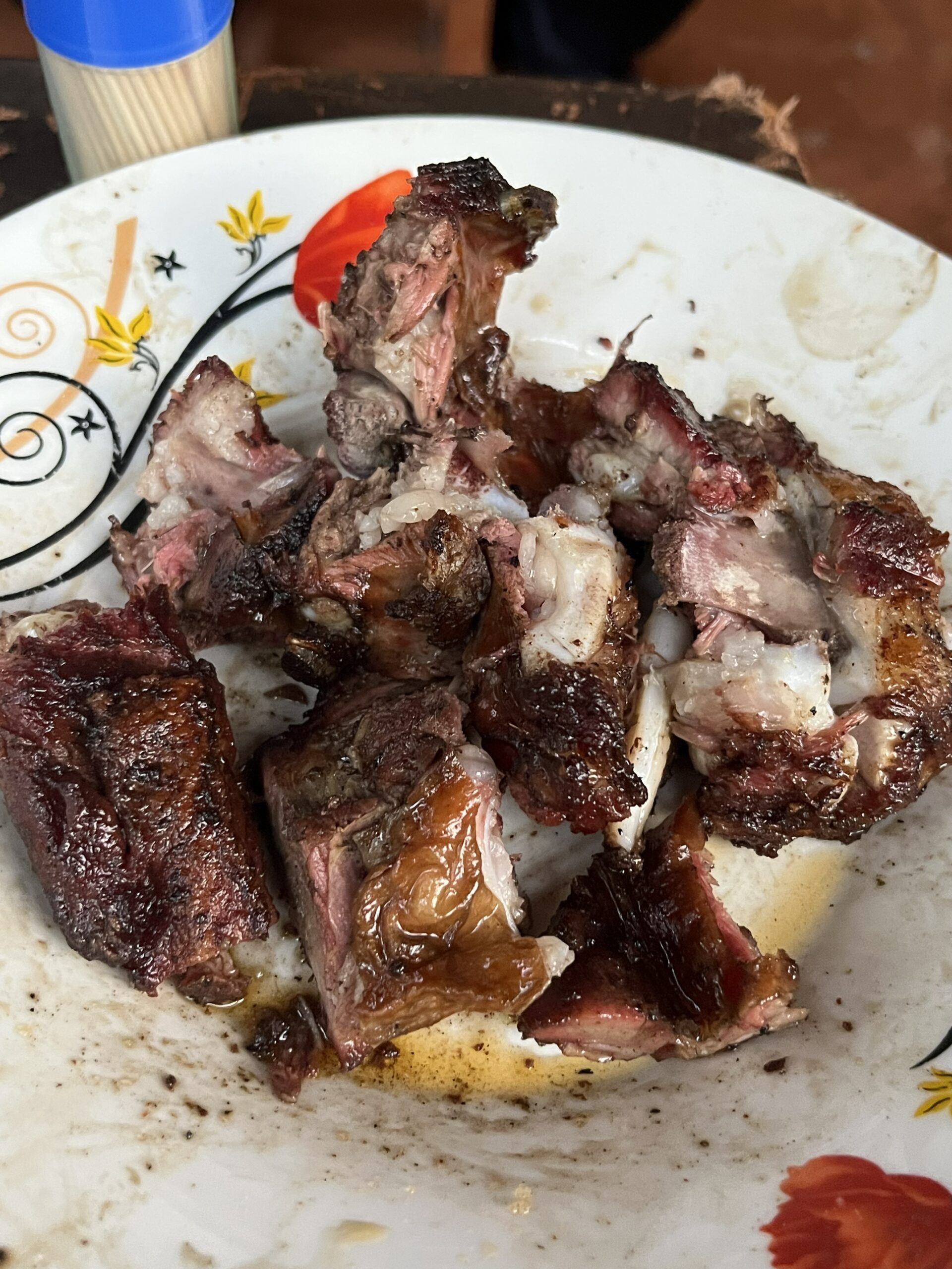日本ではヤギ肉といえば沖縄など、限られた地域でしか一般的ではないと思いますが、アフリカではほぼ全域においてポピュラーな食肉(家畜の肉)でしょう。今回、カメルーンの東部州で村のヤギを1頭買いして、屠殺・解体から始めて、焼き肉を堪能しました。食べやすい四肢の肉を始め、骨付きのあばら肉、背骨近くのいわゆる「ヒレ肉」のほか、心臓や肝臓などの新鮮な内臓肉も焼きました。消化器系の内臓や頭部は、解体を手伝ってくれた村びとが持ち帰りましたが、それぞれ煮込んで余すとこなく食べます。