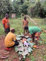 日本ではヤギ肉といえば沖縄など、限られた地域でしか一般的ではないと思いますが、アフリカではほぼ全域においてポピュラーな食肉(家畜の肉)でしょう。今回、カメルーンの東部州で村のヤギを1頭買いして、屠殺・解体から始めて、焼き肉を堪能しました。食べやすい四肢の肉を始め、骨付きのあばら肉、背骨近くのいわゆる「ヒレ肉」のほか、心臓や肝臓などの新鮮な内臓肉も焼きました。消化器系の内臓や頭部は、解体を手伝ってくれた村びとが持ち帰りましたが、それぞれ煮込んで余すとこなく食べます。