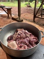 紹介者が滞在したカメルーン共和国の熱帯地域では、狩猟採集民や農耕民、他の地域から移住してきた商人らが共存している。普段見かける肉は、すでに解体され、燻製にされた状態の野生肉であり、生きた状態の動物を屠ることから調理するのを目にするのは稀である。これまで家禽である鶏を屠ることから調理をすることは何度か目にしてきたが、ヤギの場合は今回を含めて3回目であった。ヤギはアフリカの広い範囲で家畜として飼育され、特別な時に食される一般的な肉(畜肉)である。以前、沖縄で食べた際には、独特の獣臭さを感じたが、カメルーンで食べた肉はそうしたクセはなく、内臓を含めた部位ごとの味わいを楽しむことができた。狩猟採集民のなかには、家畜の肉を忌避する人がとくに老人にみられ、今回紹介したヤギのほか羊や豚を決して口にしない、という人がいるのは興味深い。