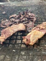 4)焼き網を置いた薪木の遠火でじっくりと焼く。生肉から焼き始めた状態で、最低でも30分ほど要す(心臓や肝臓など、小さめの肉塊)。大きな肉塊は、表面の焼けた部分を切り出し、また焼き網に戻し焼き直す。