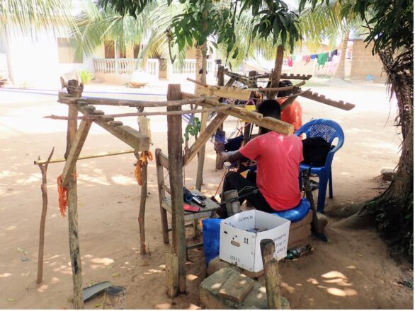 マンゴーの木が生い茂る木かげの下、しかも犬やニワトリが駆け回るむき出しの砂地の上で、「伝統的」な技術から、こんなにカラフルでポップなものが生み出されているというギャップがまぶしかった。