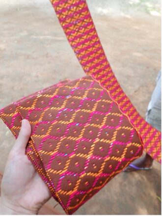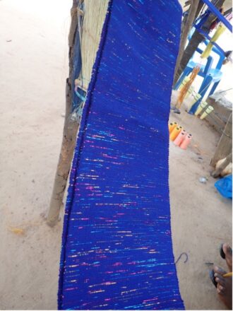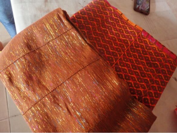 写真3, 4:執筆者がアチュに織ってもらったケテ、レインボーのラメ糸を織り込んでもらった。